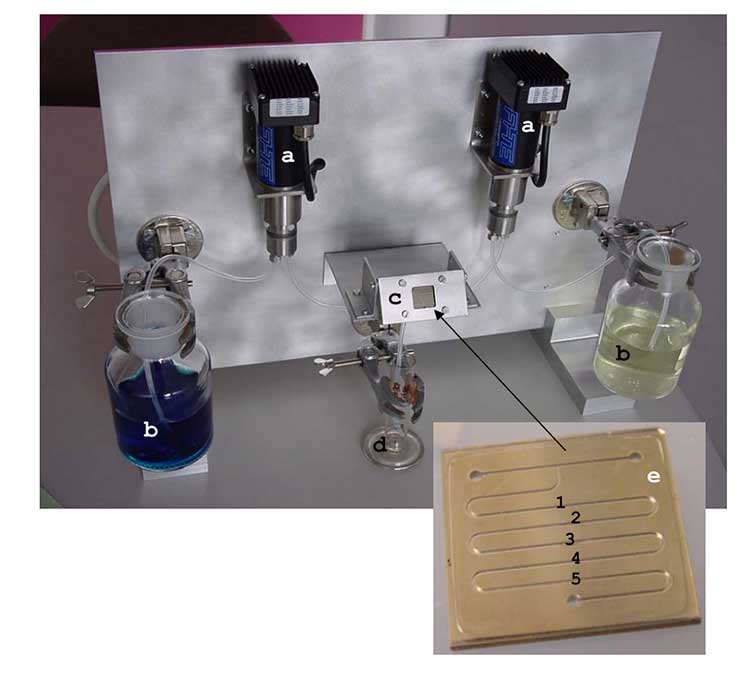 整個微型反應器系統(tǒng)需要兩臺外部計算機來控制的微型齒輪泵(微型齒輪泵品牌:彗諾HNPMikrosysteme GmbH),確保兩種離析物的混合比例以及反應器核心內(nèi)化學成分的平均停留時間都能達到較佳狀態(tài)。