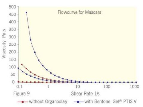 The flowcurve for the mascara with Bentone Gel PTIS V shows an increase in the low shear viscosity and thixotropy, which indicates enhanced application properties (See Figure 9).