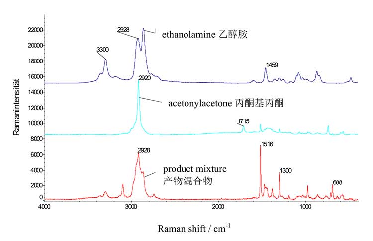 目前理想的光譜分析方法是拉曼光譜,因為拉曼信號不會被吸收或受到玻璃蓋影響。選擇Paal-Knorr-合成作為測試化學反應,使用丙酮基丙酮和乙醇胺離析物,它們的產(chǎn)物是取代吡咯。離析物和產(chǎn)物的混合物的拉曼光譜如圖3所示。
