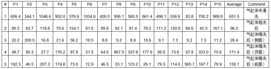 編號4 測試目的:氣缸體在清洗前,粗洗后,粗選后的清潔度差異